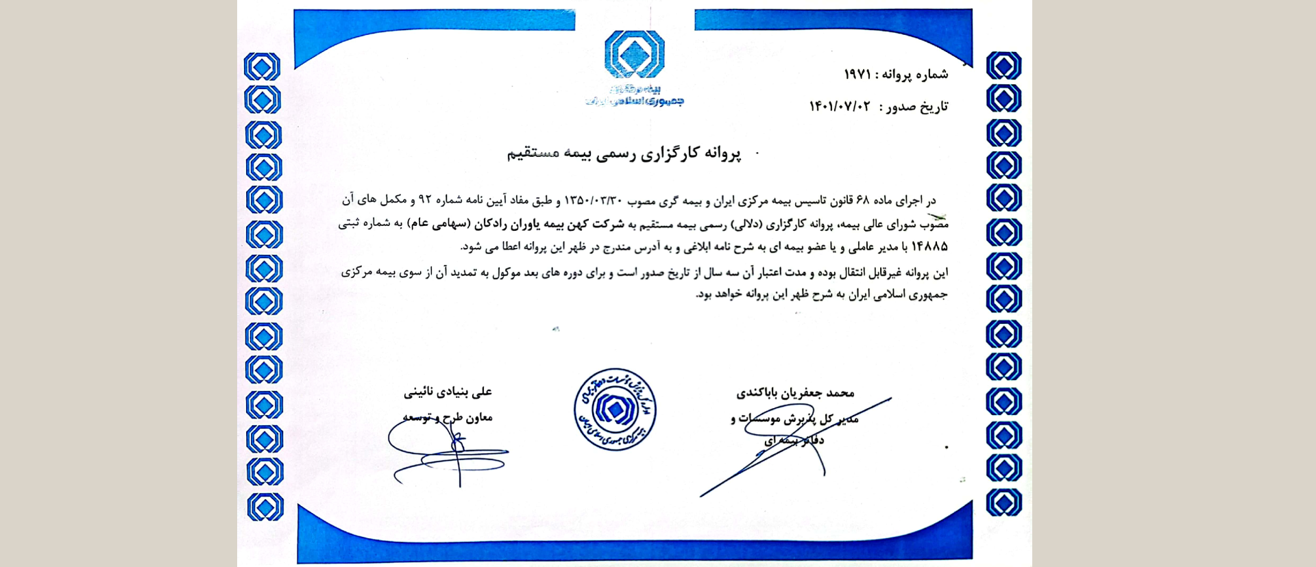 کلیه حقوق این سایت متعلق به شرکت کارگزاری رسمی بیمه مستقیم برخط کهن بیمه یاوران رادکان( سهامی عام) با شماره ثبت ۱۴۸۸۵ و شناسه ملی ۱۴۰۱۱۳۸۰۳۹۴ باشد.